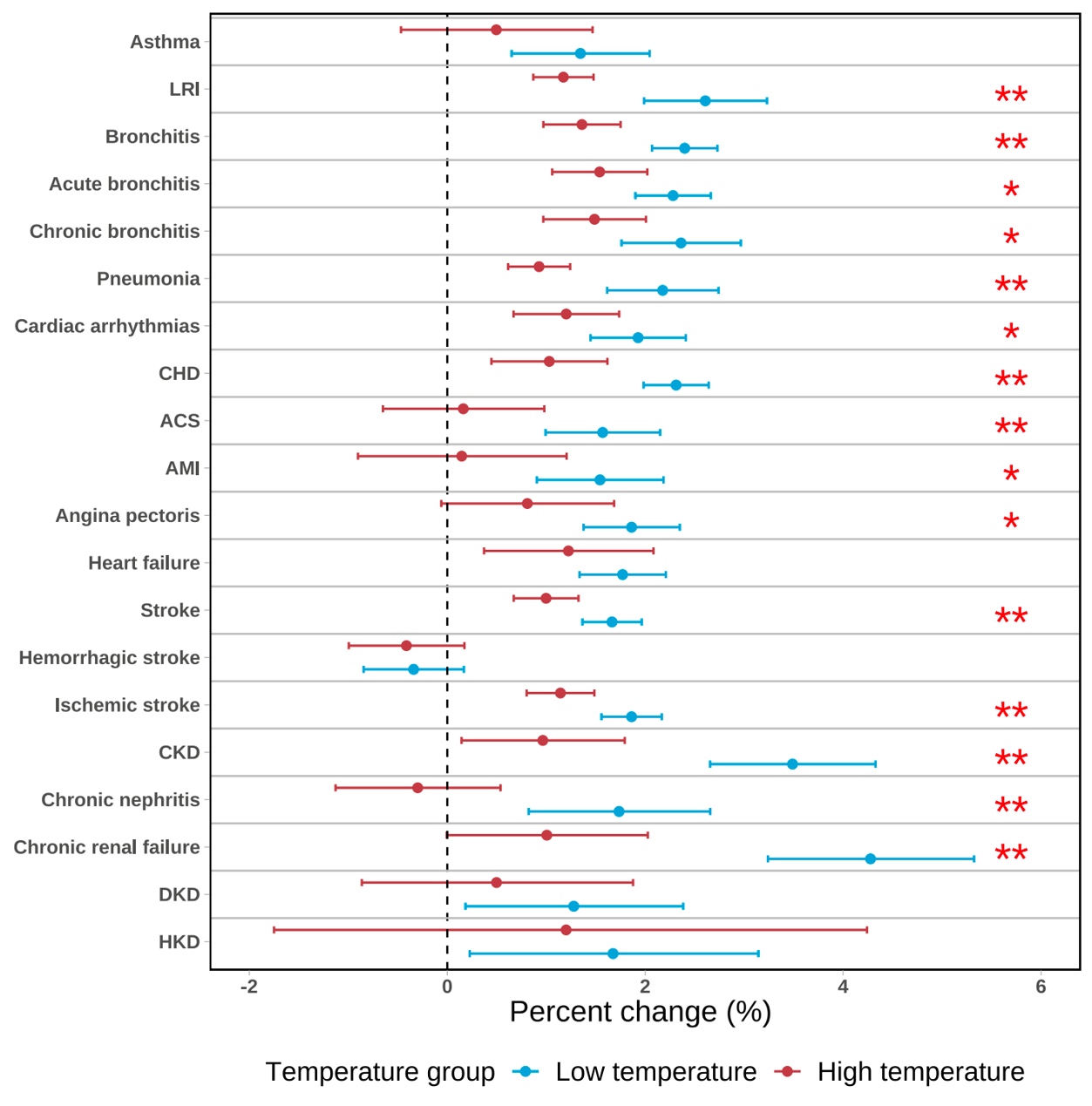 图4. 在不同温度分层下,lag01时间窗NO₂浓度每增加 10 μg/m3对应的不同疾病发作住院风险变化(结果表示为百分比变化和 95% 置信区间)
