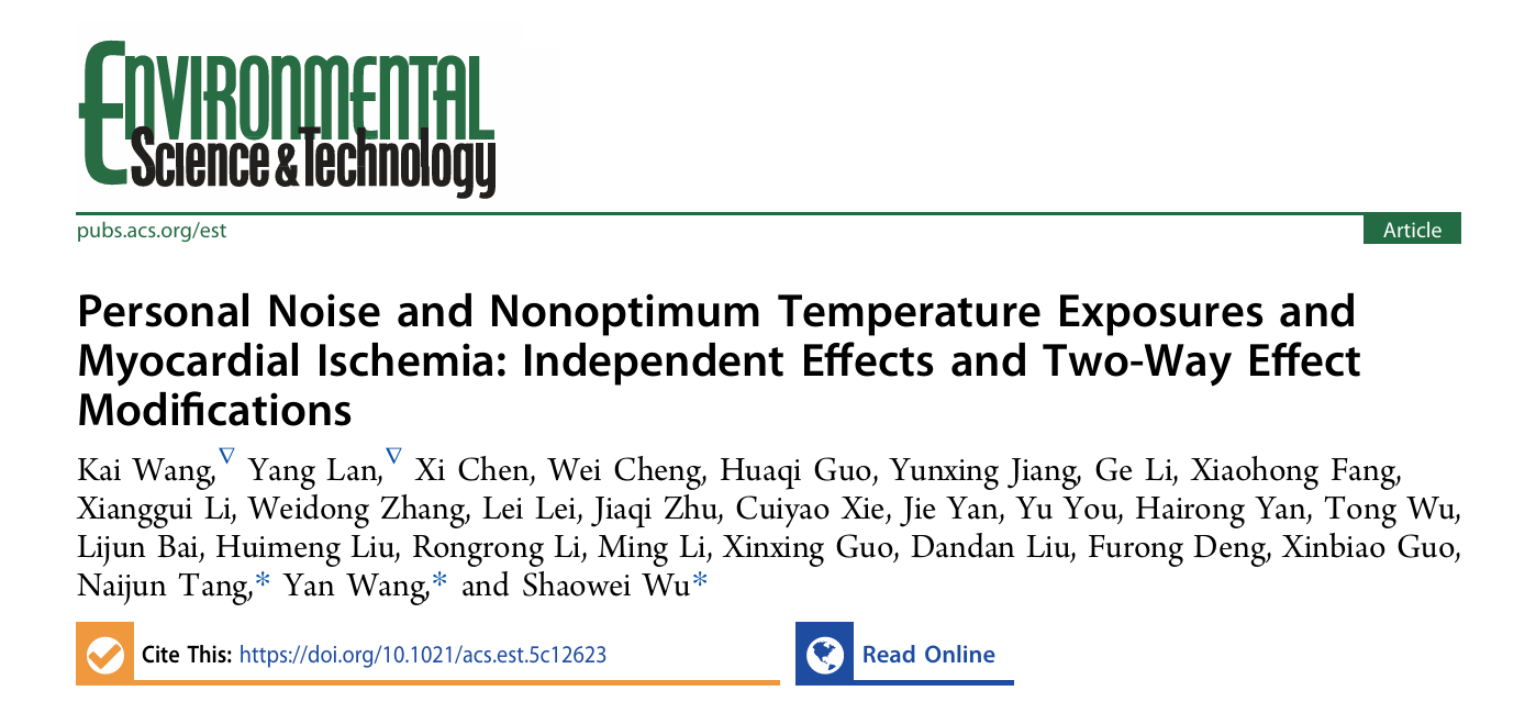 随着城市化进程和气候变化的持续加快,交通噪声和非适宜温度(温度偏高或偏低)已成为广泛存在的环境暴露因素。既往研究表明,噪声和非适宜温度均可独立增加心血管疾病的发病风险,但二者是否存在交互作用、共同影响心脏健康,尤其在短时间尺度下的急性效应作用特征,尚缺乏直接实证支撑。针对这一科学问题,公共卫生学院吴少伟教授团队开展了一项基于个体暴露精细监测的多中心定组研究,对一批研究对象进行纵向重复随访,系统评估了噪声与非适宜温度个体暴露水平对心肌缺血潜在风险的独立效应及双向修饰效应,相关研究成果近期发表于环境与健康领域国际权威期刊Environmental Science & Technology(IF=11.3)(https://pubs.acs.org/doi/10.1021/acs.est.5c12623)。